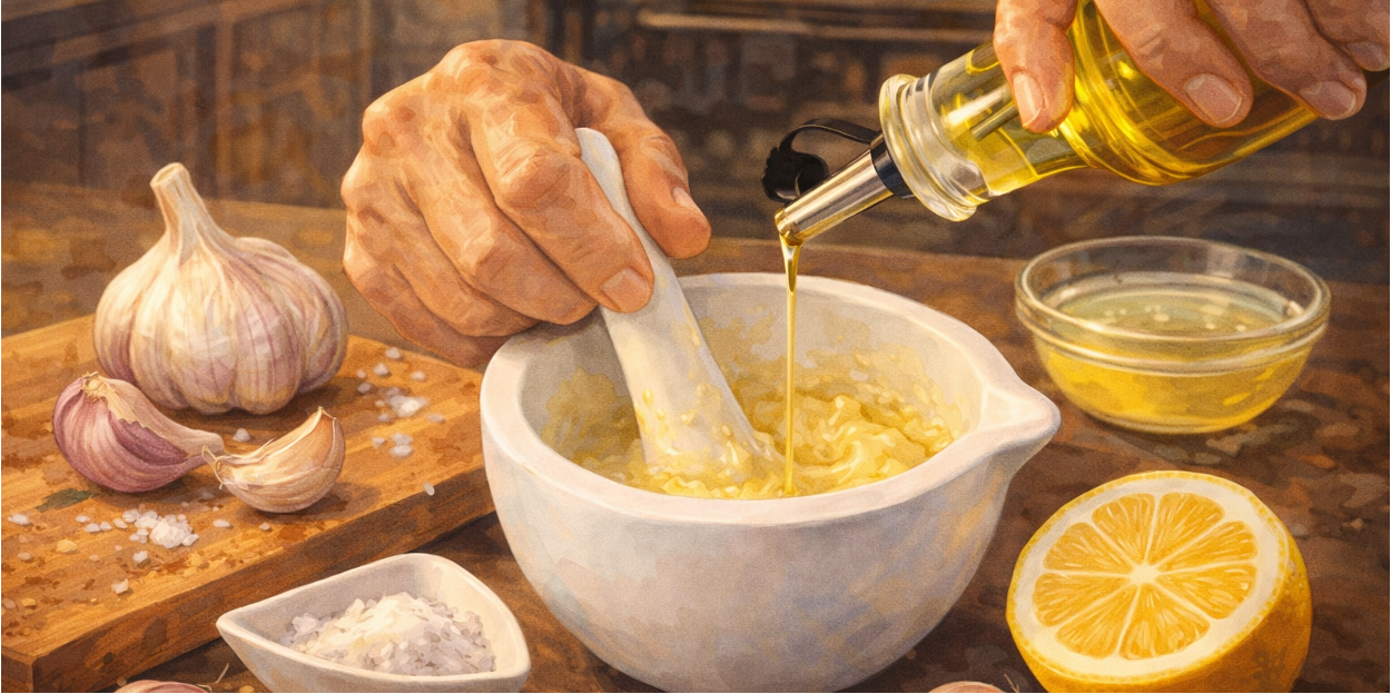 Cooks crush garlic with salt until it forms a smooth paste. Then they add olive oil slowly, drop by drop at first, while stirring constantly. This movement forces the garlic to trap the oil, creating an emulsion rather than separation.