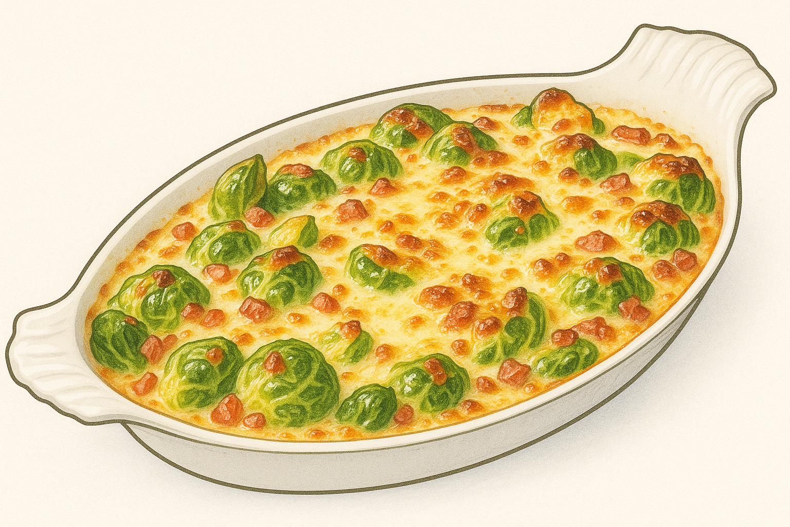 From the start, the dish leans into everything autumn cooking does best: warmth, richness, deep savouriness, and the comfort of taking your time. What arrives at the table, then, is not the stern little sprout of childhood memory, but something entirely reformed—soft at the centre, gently caramelised, wrapped in velvety Gruyère mornay, and crowned with a golden pancetta-breadcrumb crust that crackles like the season’s last leaves.