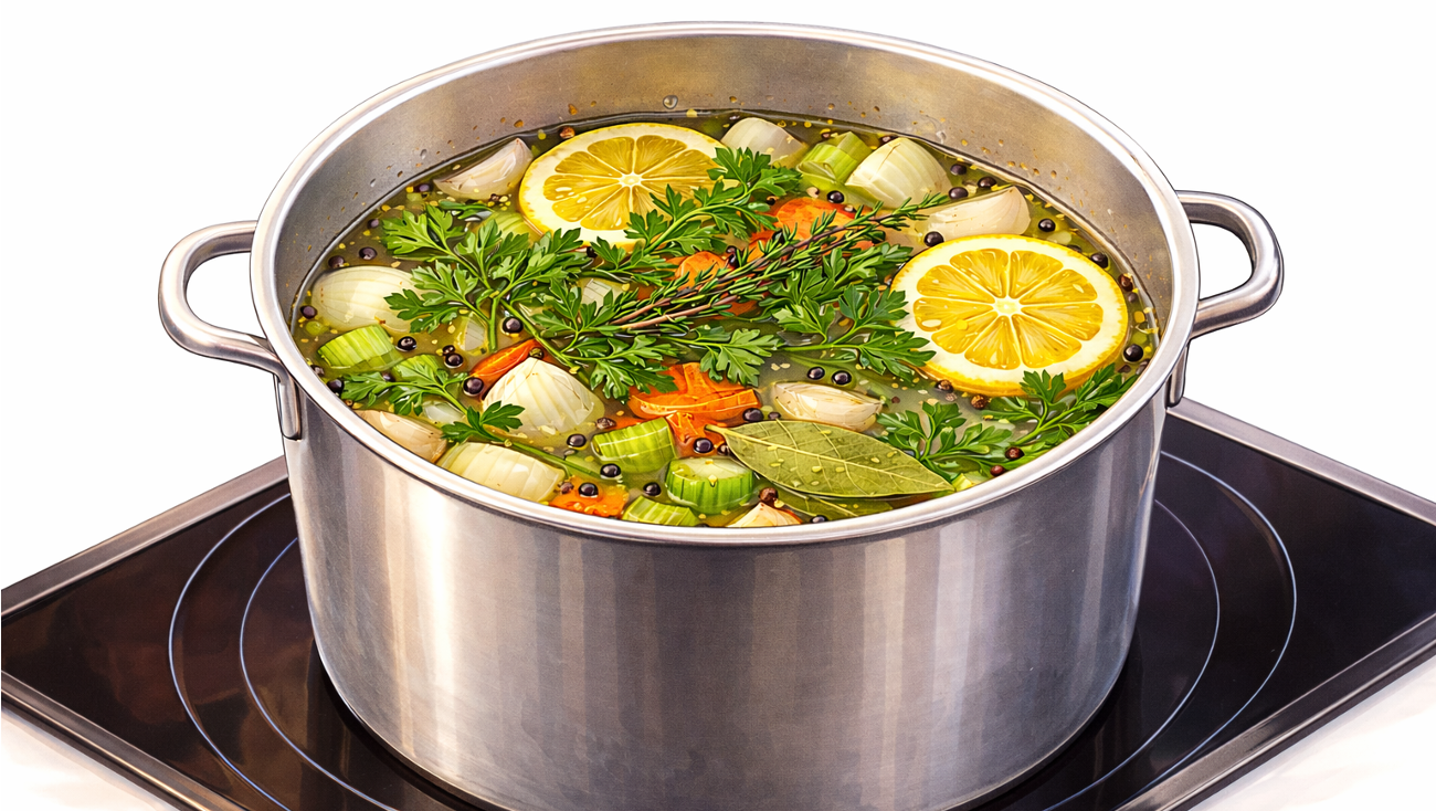 Onions, carrots, and celery provide a mild vegetable base. Parsley stems, thyme, bay leaf, and peppercorns add fragrance. White wine or vinegar introduces brightness and balance.