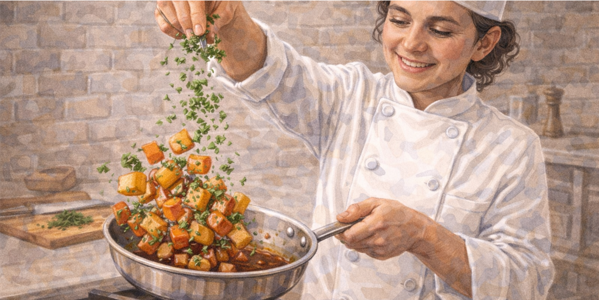 Beyond aesthetics, Glazing (Glacer)locks flavour onto the surface of food. Instead of the sauce remaining separate, it integrates with the ingredient itself. A glazed vegetable tastes fuller because its natural sugars combine with butter or stock. A glazed meat carries a balanced coating that intensifies savouriness.