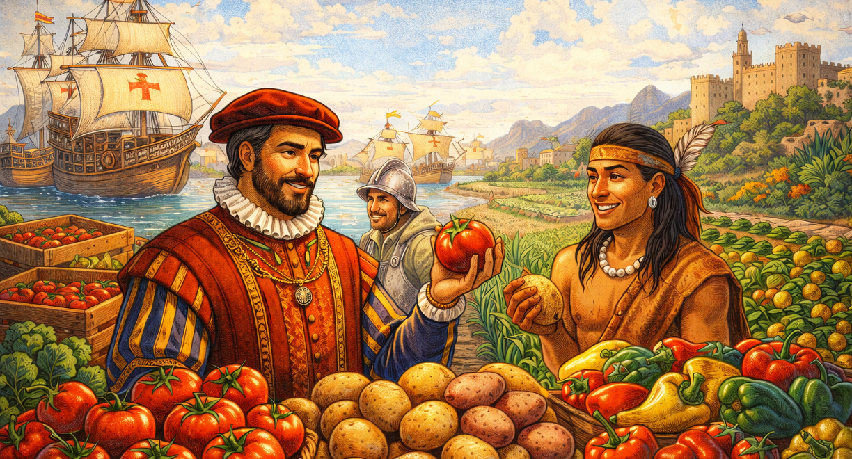 When Spaniards first crossed the Atlantic in 1492, they did not just return with gold, silver, and stories — they returned with plants that would quietly, and then dramatically, reshape their kitchen. What we now think of as “traditional” Spanish food is, in fact, deeply marked by the encounter with the Americas. Tomatoes, peppers, potatoes, chillies, cacao, vanilla, and maize are some of the most important New World Ingredients that arrived slowly at first, then became so embedded in daily life that their foreign origins are often forgotten. These New World Ingredients changed the Spanish kitchen forever.
