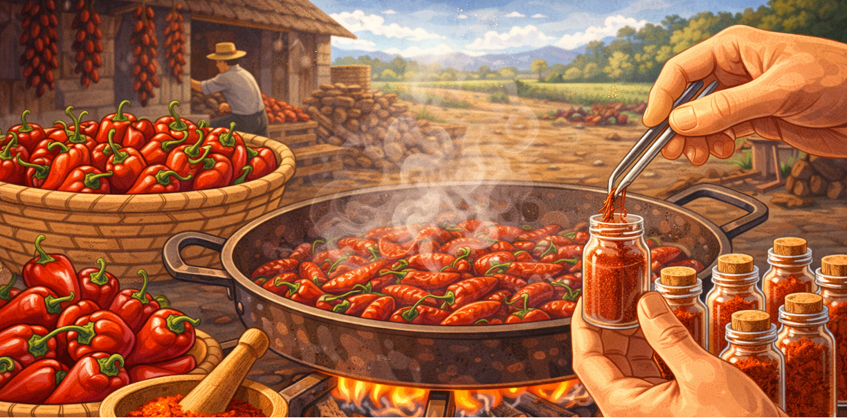 Pimentón de la Vera comes from La Vera, a small region in Extremadura. The peppers used—varieties of Capsicum annuum—are harvested ripe and red. Instead of drying in the sun or mechanically, they dry slowly over smoldering oak fires, developing the hallmark taste of true pimenton.