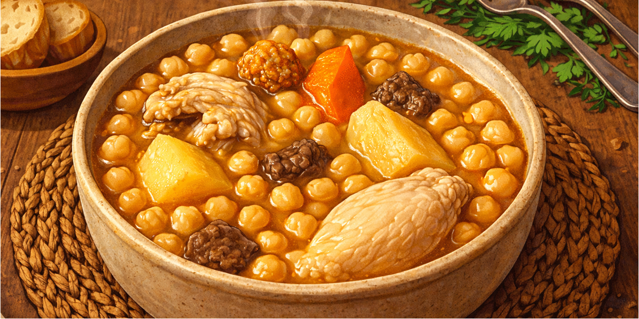 At its simplest, puchero is a slow-simmered pot of meat, chickpeas, vegetables, and aromatics. But this simplicity conceals deep culinary intelligence. Spanish cooks historically did not think in terms of “one dish”; they thought in terms of one pot becoming many meals. Puchero is the classic expression of that mindset.
