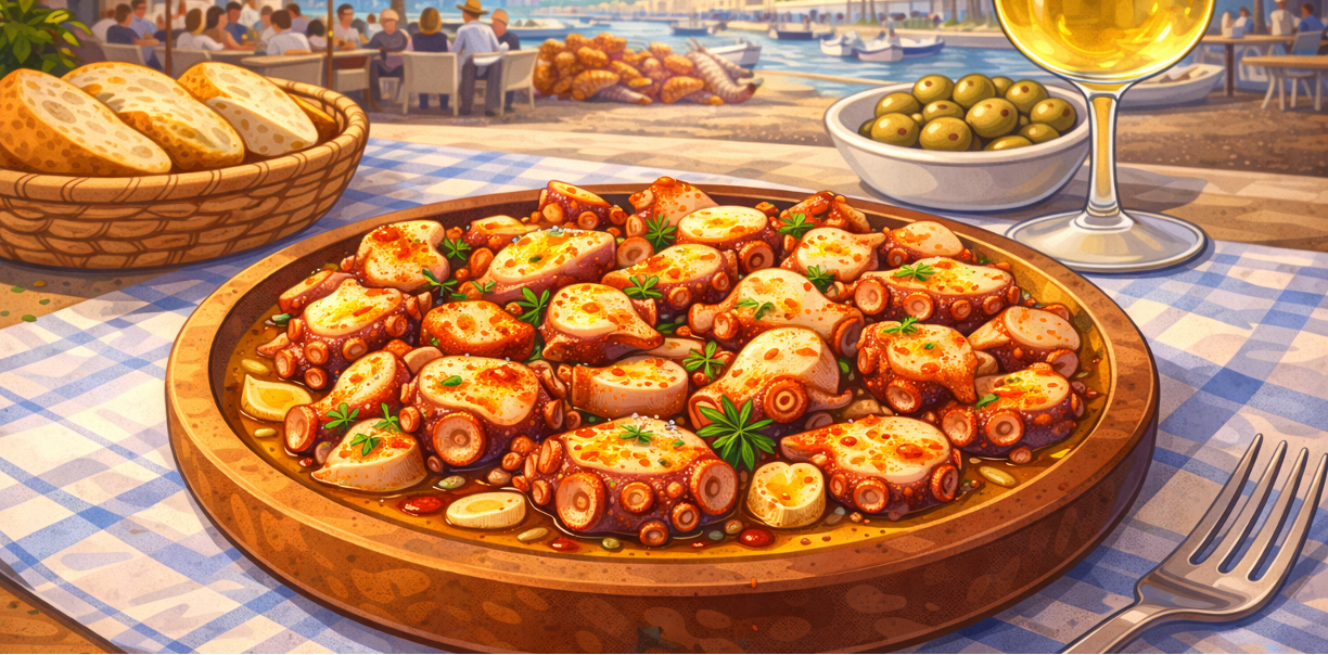 Pulpo a la gallega—also known as pulpo a feira—comes from northwestern Spain, where octopus fishing shaped coastal life. For centuries, octopus traveled inland to markets and fairs, preserved through drying and later rehydrated before cooking.