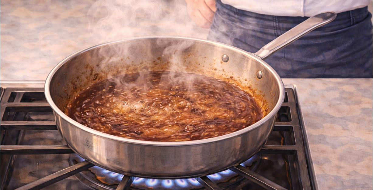 When a liquid gently simmers and gradually thickens, something remarkable happens. Water evaporates, flavours intensify, aromas deepen, and texture becomes silkier. What begins as a thin broth or wine can turn into a glossy sauce rich with character.