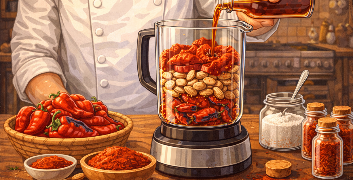Romesco achieves depth through careful layering rather than abundance. For the complex flavors of a traditional romesco sauce, dried ñora or choricero peppers provide sweetness and color, while roasted tomatoes add body and acidity. Almonds or hazelnuts contribute richness and texture, and garlic brings sharpness that cuts through the sauce’s density. Olive oil binds everything together, creating a thick, spoonable consistency. Importantly, vinegar sharpens the final profile, preventing the sauce from becoming heavy. Each ingredient plays a precise role, and removing one disrupts the balance.