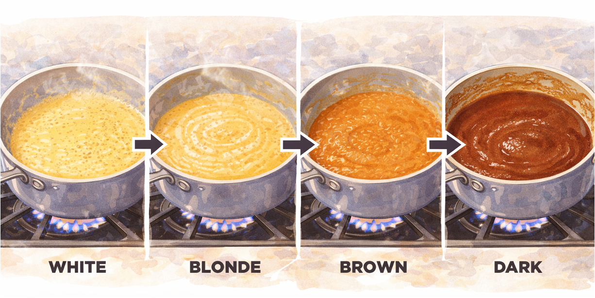 Roux changes character depending on how long it cooks. Each stage serves a different purpose.