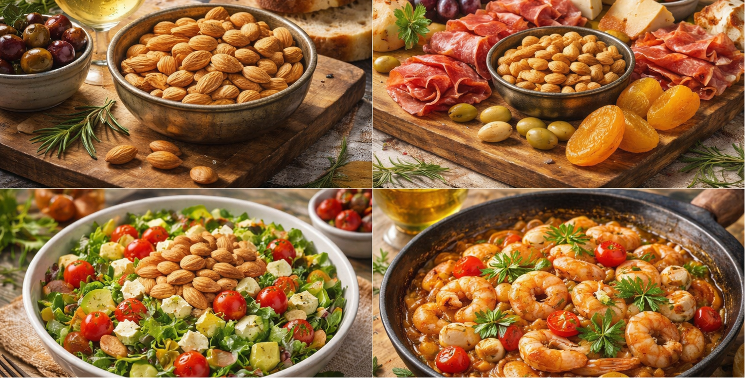 Romesco, the Catalan sauce of roasted peppers, tomatoes, garlic, and almonds, shows another side of the nut: earthy, smoky, and robust. Here almonds give weight to grilled vegetables, fish, or calçots (spring onions), preventing the sauce from feeling thin or sharp.