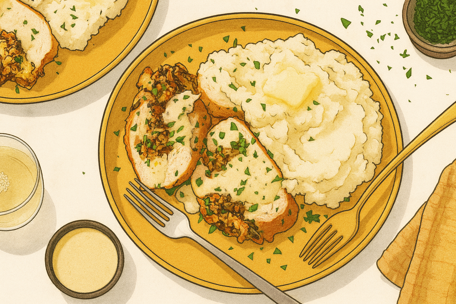 Importantly, this is a dish designed for smaller gatherings—festive without excess, generous without demanding a full bird. Because the mushroom–cranberry filling does the heavy lifting, the breast remains juicy while each slice carries sweet-sharp bursts and earthy depth. And without cheese weighing it down, the dish feels lighter and more elegant—still comforting, but never heavy.