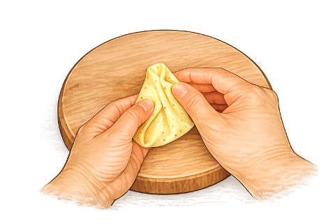 Add cold water gradually. Bring the dough together into a firm, tight mass. It should feel stiffer than roti dough and should not be soft or elastic. - Rest